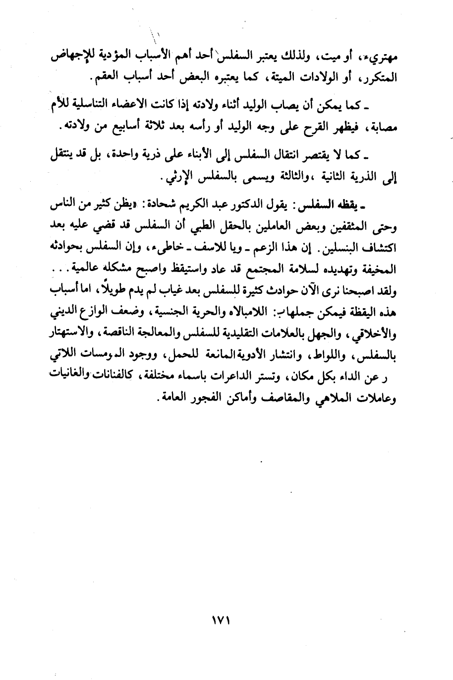 - يقظه السفلس: يقول الدكتور عبد الكريم شحادة " يظن كثير من الناس وحتى المثقفين وبعض العاملين بالحقل الطبي أن السفلس قد قضي عليه بعد اكتشاف البنسلين.