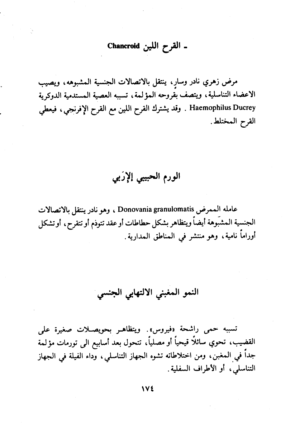 - القرح اللين Chancroid مرض زهري نادر وسار، ينتقل بالاتصالات الجنسية المشبوهة، ويصيب الأعضاء التناسلية، ويتصف بقروحه المؤلمة، تسببه العصبية المستدمية الدوكرية Haemophilus Ducrey. وقد يشترك القرح اللين مع القرح الإفرنجي، فيعطي القرح المختلط. الورم الحبيبي الإربي عامله المرض Donovania granulomatis، وهو نادر ينتقل بالاتصالات الجنسية المشبوهة أيضا ويتظاهر بشكل حطاطات أو عقد تتوذم أو تتقرح، أو تشكل أوراما نامية، وهو منتشر في المناطق المدارية. النمو المغبني الالتهابي الجنسي تسببه حمى راشحة " فيروس " ويتظاهر بحويصلات صغيرة على القضيب، تحوي سائلا قيحيا أو مصليا، تتحول بعد أسابيع إلى تورمات مؤلمة جدا في المغبن، ومن اختلاطاته تشوه الجهاز التناسلي، وداء الفيلة في الجهاز التناسلي، أو الأطراف السفلية.