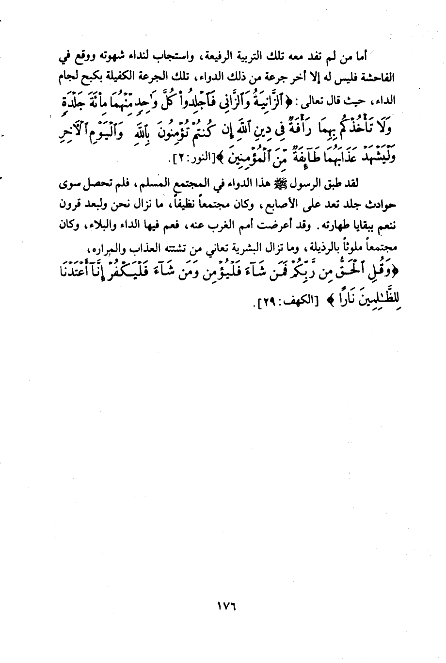 أما من لم تفد معه تلك التربية الرفيعة، واستجاب لنداء شهوته ووقع في الفاحشة فليس له إلا أخر جرعة من ذلك الدواء، تلك الجرعة الكفيلة بكبح لجام الداء، حيث قال تعالى: (الزانية والزاني فاجلدوا كل وحد منهما مائة جلدة ولا تأخذكم بهما رأفة في دين الله إن كنتم تؤمنون بالله واليوم الآخر وليشهد عذابهما طائفة من المؤمنين) [النور: 2] .