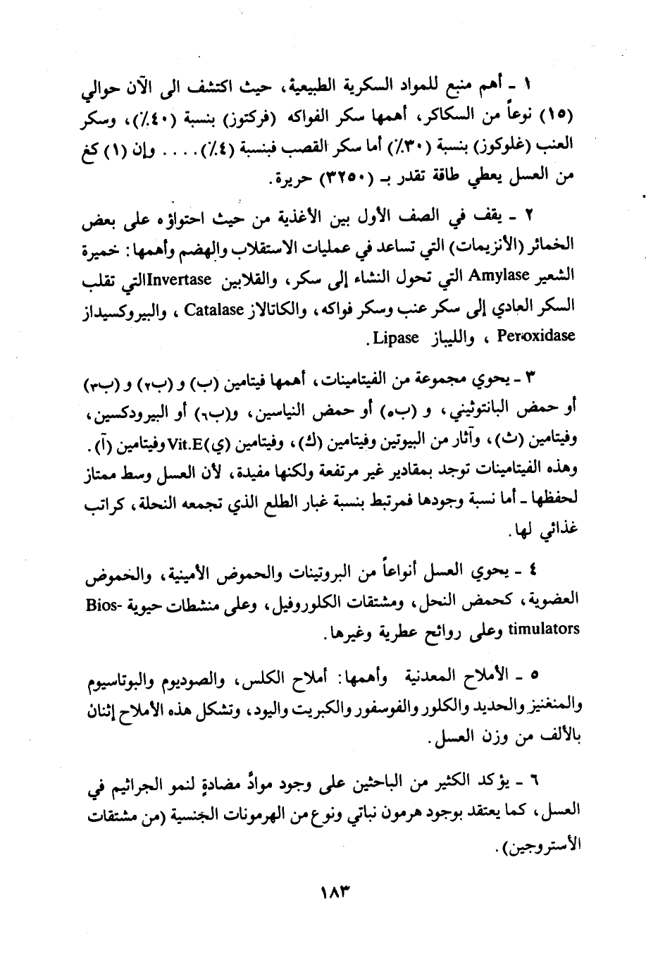 1 - أهم منبع للمواد السكرية الطبيعية، حيث اكتشف إلى الآن حوالي (15) نوعا من السكاكر، أهمها سكر الفواكه (فركتوز) بنسبة (40 %) ، وسكر العنب (غلوكوز) بنسبة (30 %) أما سكر القصب فبنسبة (4 %) . . . وإن (1) كغ من العسل يعطي طاقة تقدر ب (3250) حريرة.