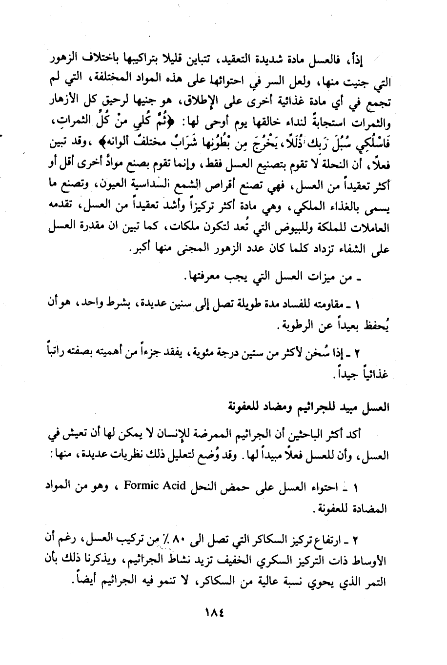 1 - احتواء العسل على حمض النحل Formic Acid، وهو من المواد المضادة للعفونة.