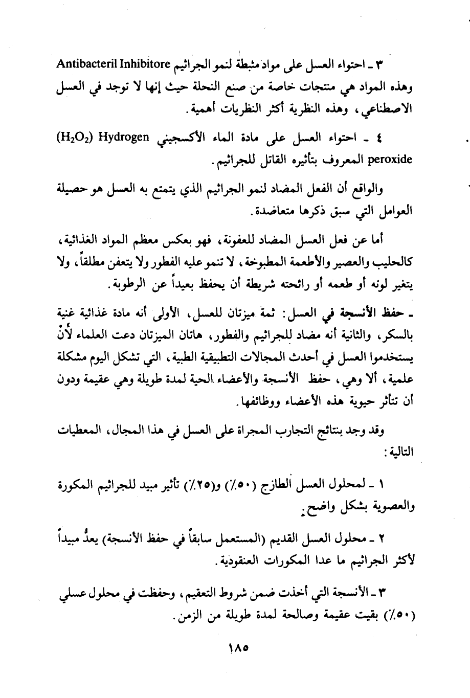 1 - لمحلول العسل الطازج (50 %) و (25 %) تأثير مبيد للجراثيم المكورة والعصوية بشكل واضح. 2 - محلول العسل القديم (المستعمل سابقا في حفظ الأنسجة) يعد مبيدا لأكثر الجراثيم ما عدا المكورات العنقودية.
