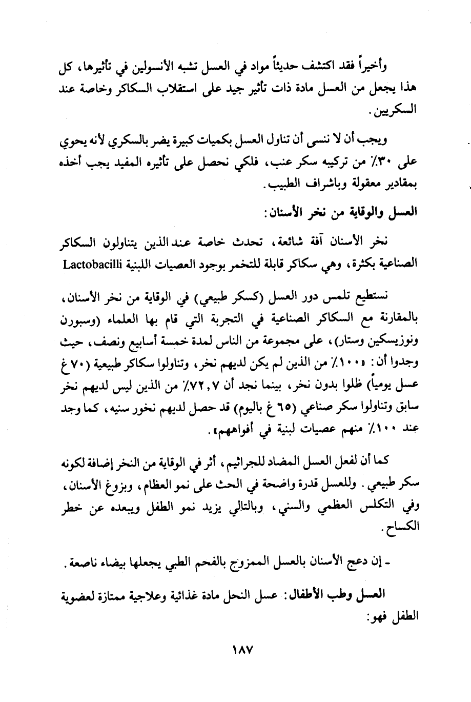 وأخيرا فقد اكتشف حديثا مواد في العسل تشبه الأنسولين في تأثيرها، كل هذا يجعل من العسل مادة ذات تأثير جيد على استقلاب السكاكر وخاصة عند السكريين. ويجب أن لا ننسى أن تناول العسل بكميات كبيرة يضر بالسكري لأنه يحوي على 30 % من تركيبه سكر عنب، فلكي نحصل على تأثيره المفيد يجب أخذه بمقادير معقولة وباشراف الطبيب.