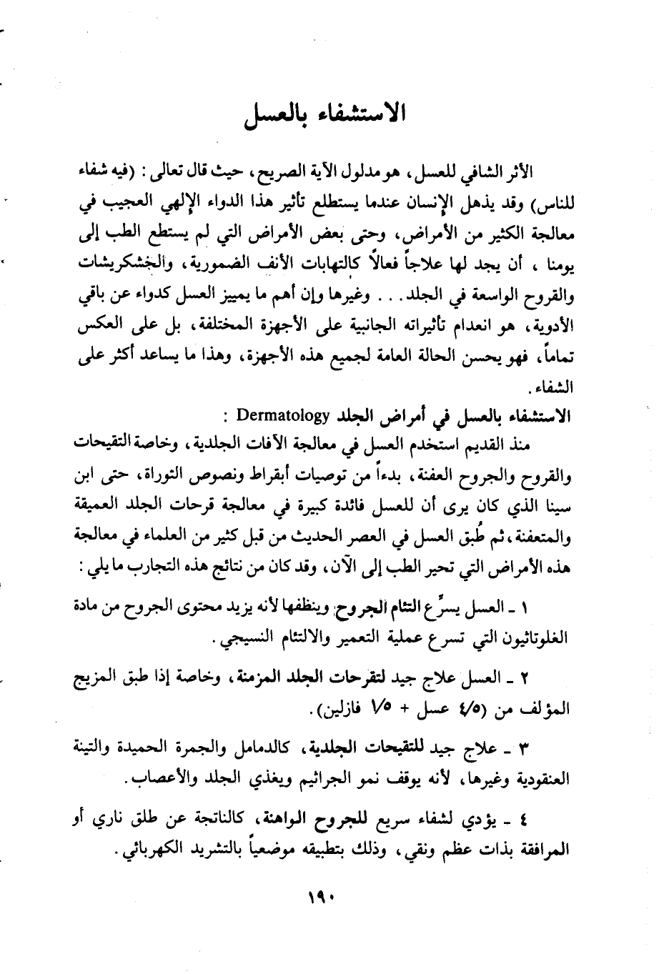 حتى ابن سينا الذي كان يرى أن للعسل فائدة كبيرة في معالجة قرحات الجلد العميقة والمتعفنة، ثم طبق العسل في العصر الحديث من قبل كثير من العلماء في معالجة هذه الأمراض التي تحير الطب إلى الآن، وقد كان من نتائج هذه التجارب ما يلي: