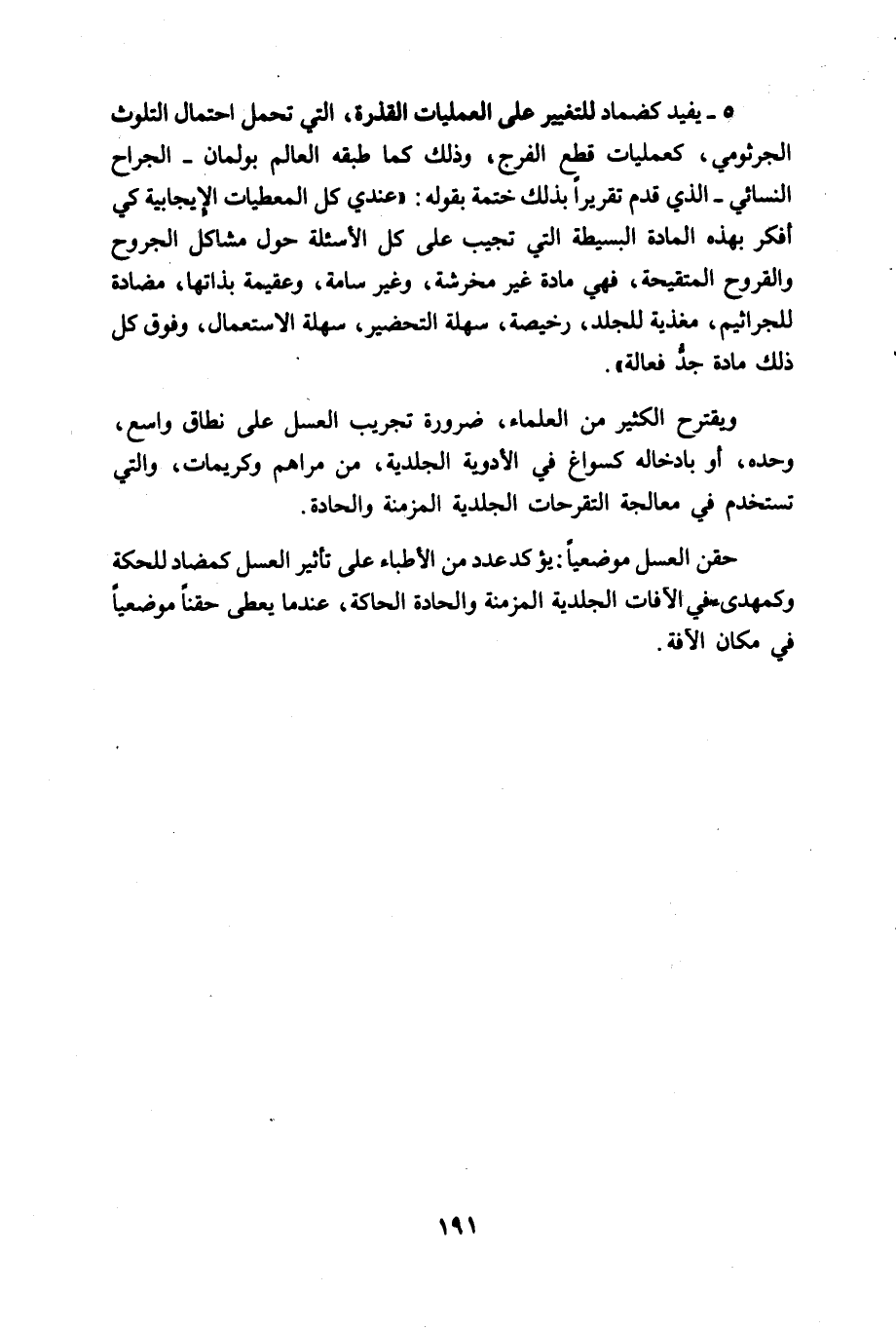 5 - يفيد كضماد للتغير على العمليات القذرة، التي تحمل احتمال التلوث الجرثومي. كعمليات قطع الفرج، وذلك كما طبقه العالم بولمان - الجراح النسائي - الذي قدم تقريرا بذلك ختمة بقوله: " عندي كل المعطيات الايجابية كي أفكر بهذه المادة البسيطة التي تجيب على كل الأسئلة حول مشاكل الجروح والقروح المتقيحة، فهي مادة غير مخرشة، وغير سامة، وعقيمة بذاتها، مضادة للجراثيم، مغذية للجلد، رخيصة، سهلة التحضير، سهلة الاستعمال، وفوق كل ذلك مادة جد فعالة ".