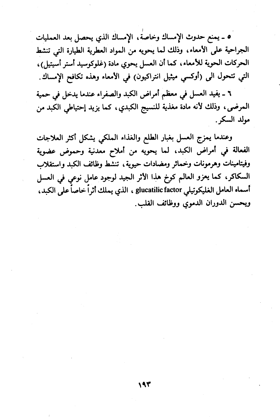 6 - يفيد العسل في معظم أمراض الكبد والصفراء عندما يدخل في حمية المرضى، وذلك لأنه مادة مغذية للنسيج الكبدي، كما يزيد احتياطي الكبد من مولد السكر.
