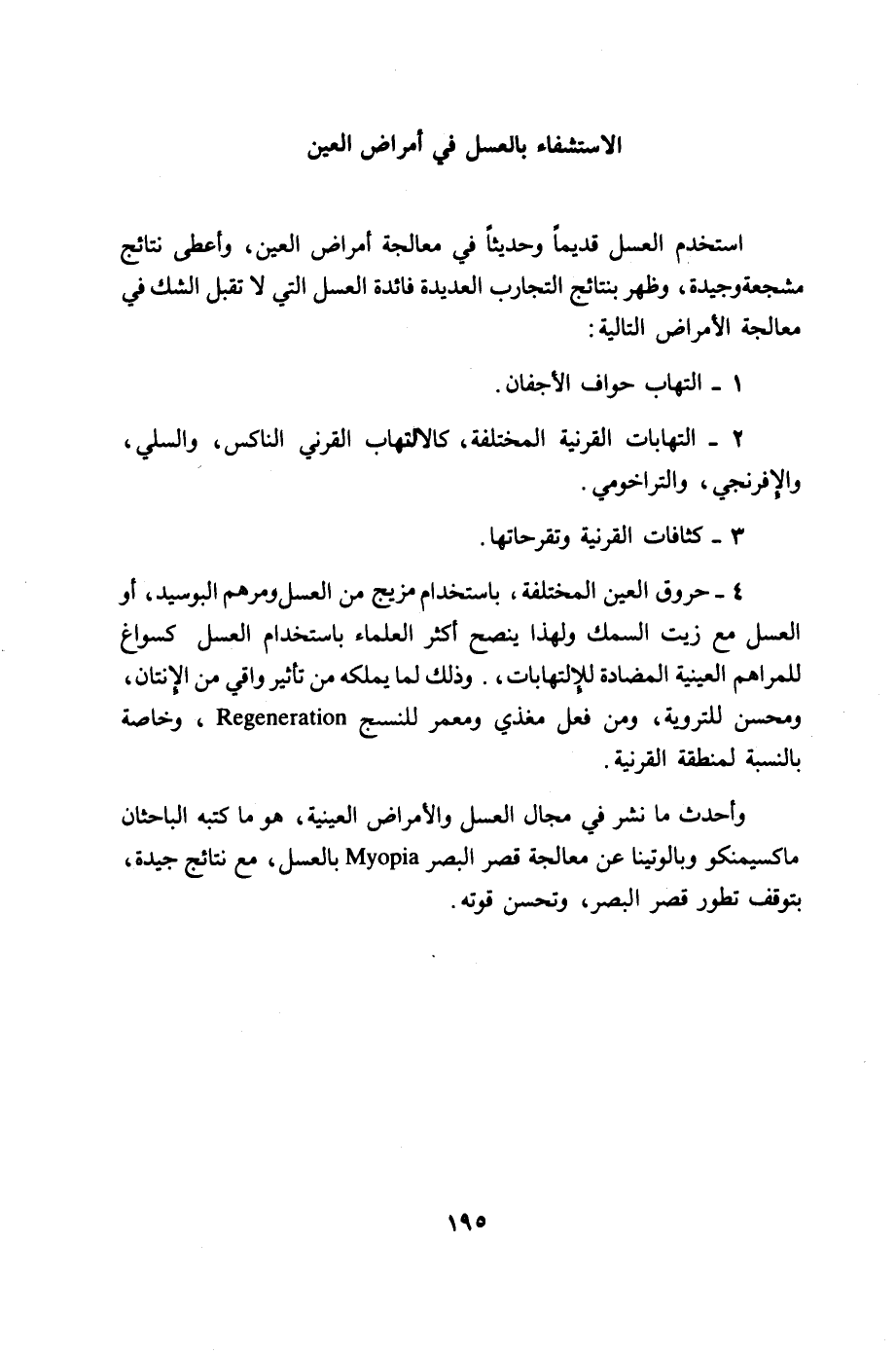 4 - حروق العين المختلفة، باستخدام مزيج من العسل ومرهم البوسيد، أو العسل مع زيت السمك ولهذا ينصح أكثر العلماء باستخدام العسل كسواغ للمراهم العينية المضادة للالتهابات، وذلك لما يملكه من تأثير واقي من الانتان، ومحسن للتروية، ومن فعل مغذي ومعمر للنسج Regeneration، وخاصة بالنسبة لمنطقة القرنية. وأحدث ما نشر في مجال العسل والأمراض العينية، هو ما كتبه الباحثان ما كسيمنكو وبالوتينا على معالجة قصر البصر Myopia بالعسل، مع نتائج جيدة.