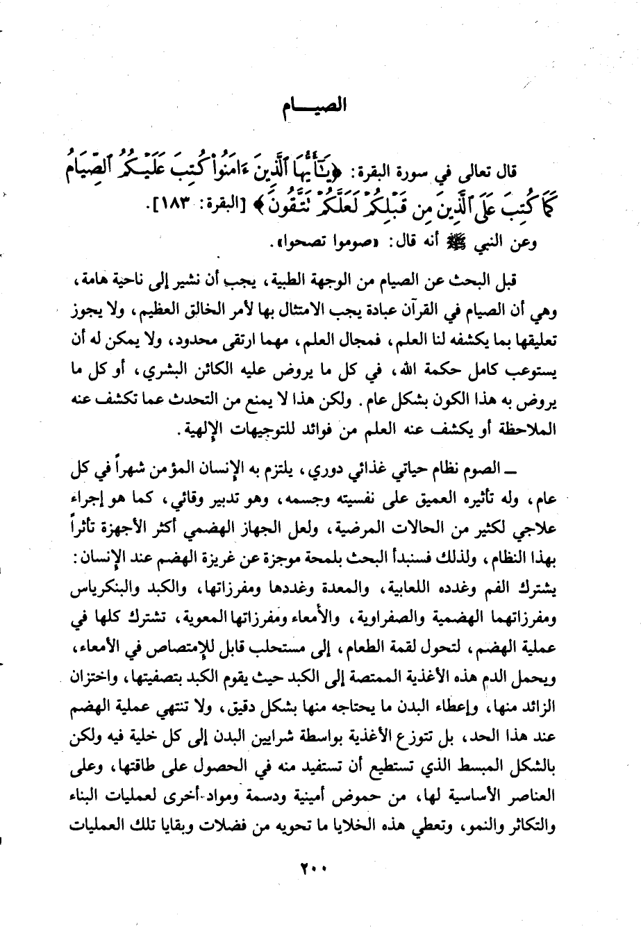 قبل البحث عن الصيام من الوجهة الطبية، يجب أن نشير إلى ناحية هامة، وهي أن الصيام في القرآن عبادة يجب الامتثال بها لأمر الخالق العظيم، ولا يجوز تعليقها بما يكشفه لنا العلم، فمجال العلم، مهما ارتقى محدود، ولا يمكن له أن يستوعب كامل حكمة الله، في كل ما يروض عليه الكائن البشري، أو كل ما يروض به هذا الكون بشكل عام.