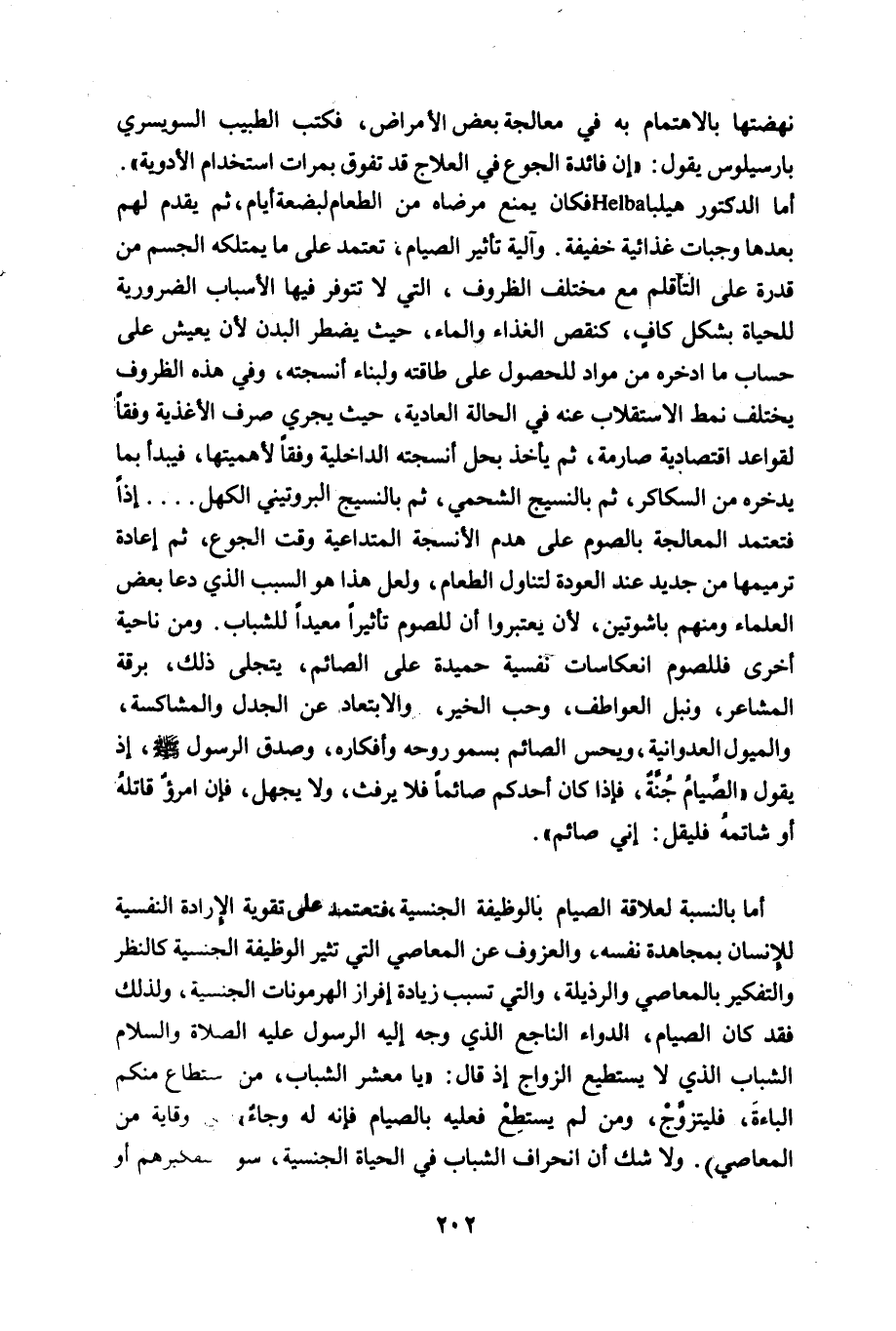 أما بالنسبة لعلاقة الصيام بالوظيفة الجنسية، فتعتمد على تقوية الإرادة النفسية للانسان بمجاهدة نفسه، والعزوف عن المعاصي التي تثير الوظيفة الجنسية كالنظر والتفكير بالمعاصي والرذيلة، والتي تسبب زيادة إفراز الهرمونات الجنسية، ولذلك فقد كان الصيام، الدواء الناجع الذي وجه إليه الرسول عليه الصلاة والسلام الشباب الذي لا يستطيع الزواج إذ قال: " يا معشر الشباب، من استطاع منكم الباءة، فليتزوج، ومن لم يستطع فعليه بالصيام فإنه له وجاء " (أي وقاية من المعاصي) ولا شك أن انحراف الشباب في الحياة الجنسية، سواء بتفكيرهم أو