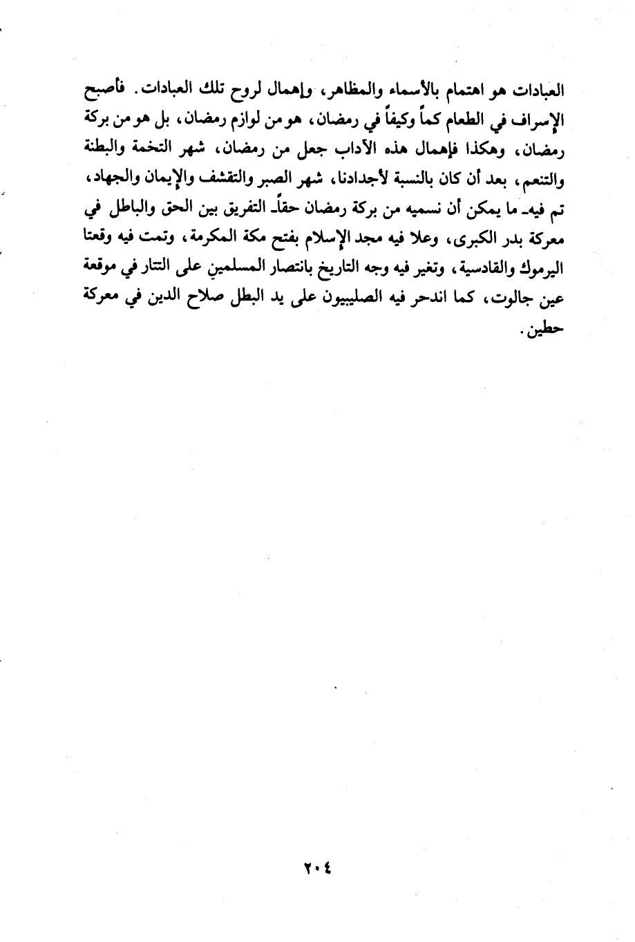 العبادات هو اهتمام بالأسماء والمظاهر، وإهمال لروح تلك العبادات، فأصبح الاسراف في الطعام كما وكيفا في رمضان، هو من لوازم رمضان، بل هو من بركة رمضان، وهكذا فإهمال هذه الآداب جعل من رمضان، شهر التخمة والبطنة والتنعم، بعد أن كان بالنسبة لأجدادنا، شهر الصبر والتقشف والايمان والجهاد، ثم فيه - ما يمكن أن نسميه من بركة رمضان حقا - التفريق بين الحق والباطل في معركة بدر الكبرى، وعلا فيه مجد الاسلام بفتح مكة المكرمة، وتمت فيه وقعتا اليرموك والقادسية، وتغير فيه وجه التاريخ بانتصار المسلمين على التتار في موقعة عين جالوت، كما اندحر فيه الصليبيون على يد البطل صلاح الدين في معركة حطين.