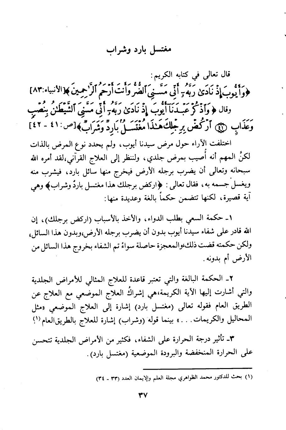 اختلفت الآراء حول مرض سيدنا أيوب، ولم يحدد نوع المرض بالذات لكن المهم أنه أصيب بمرض جلدي، ولنظر إلى العلاج القرآني، لقد أمره الله سبحانه وتعالى أن يضرب برجله الأرض فيخرج منها سائل بارد، فيشرب منه ويغسل جسمه به، فقال تعالى: (اركض برجلك هذا مغتسل بارد وشراب) وهي آية قصيرة، لكنها تتضمن حكما بالغة وعديدة منها: