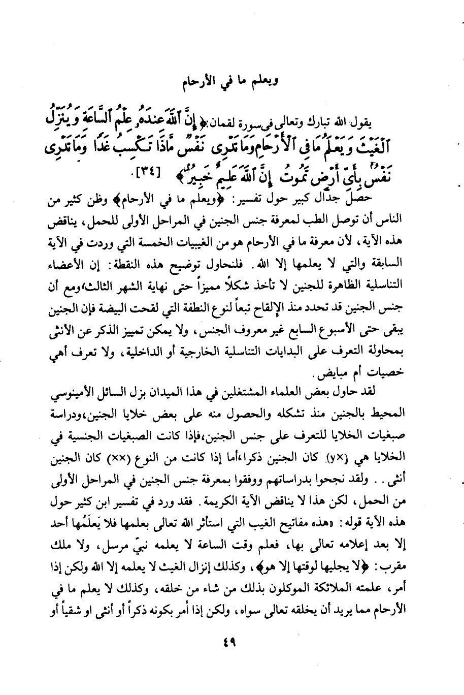 لقد حاول بعض العلماء المشتغلين في هذا الميدان بزل السائل الامينوسي المحيط بالجنين منذ تشكله والحصول منه على بعض خلايا الجنين، ودراسة صبغيات الخلايا للتعرف على جنس الجنين، فإذا كانت الصبغيات الجنسية في الخلايا هي (yx) كان الجنين ذكرا، أما إذا كانت من النوع (xx) كان الجنين أنثى، ولقد نجحوا بدراساتهم ووفقوا بمعرفة جنس الجنين في المراحل الأولى من الحمل، لكن هذا لا يناقض الآية الكريمة، فقد ورد في تفسير ابن كثير حول هذه الآية قوله: " هذه مفاتيح الغيب التي استأثر الله بعلمها فلا يعلمها أحد إلا بعد إعلامه تعالى بها، فعلم وقت الساعة لا يعلمه نبي مرسل، ولا ملك مقرب: (لا يجليها لوقتها إلا هو) وكذلك إنزال الغيب لا يعلمه إلا الله ولكن إذا أمر، علمته الملائكة الموكلون بذلك من شاء من خلقه، وكذلك لا يعلم ما في الأرحام مما يريد أن يخلقه تعالى سواه، ولكن إذا أمر بكونه ذكرا أو أنثى أو شقيا أو
