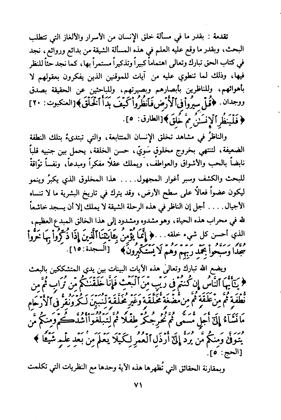 والناظر في مشاهد تخلق الانسان المتتابعة. والتي تبتدئ بتلك النطفة الضعيفة، لتنتهي بخروج مخلوق سوي. حسن الخلقة، يحمل بين جنبيه قلبا نابضا بالحب والأشواق والعواطف. ويملك عقلا مفكرا ومبدعا، ونفسا تواقة للبحث والكشف وسبر أغوار المجهول. . . هذا المخلوق الذي يكبر وينمو ليكون عضوا فعالا على سطح الأرض.
