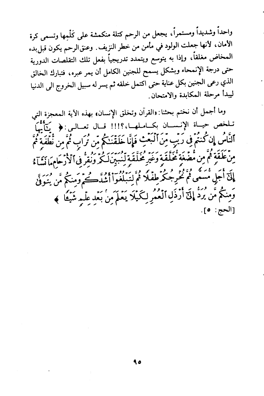 وما أجمل أن نختم بحثنا " القرآن وتخلق الانسان " بهذه الآية المعجزة التي تلخص حياة الانسان بكاملها،؟ ! قال تعالى: (يا أيها الناس إن كنتم في ريب من البعث فإنا خلقناكم من تراب ثم من نطفة ثم من علقة ثم من مضغة مخلقة وغير مخلقة لنبين لكم ونقر في الأرحام ما نشاء إلى أجل مسمى ثم نخرجكم طفلا ثم لتبلغوا أشدكم ومنكم من يتوفى ومنكم من يرد إلى أرذل العمر لكيلا يعلم من بعد علم شيئا) [الحج: 5] .