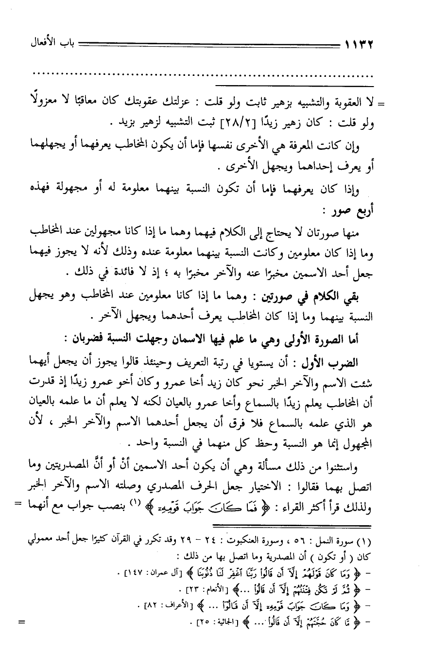 واستثنوا من ذلك مسألة وهي أن يكون أحد الاسمين أن أو أنّ المصدريتين وما اتصل بهما فقالوا: الاختيار جعل الحرف المصدري وصلته الاسم والآخر الخبر ولذلك قرأ أكثر القراء: فَما كانَ جَوابَ قَوْمِهِ * (¬1) بنصب جواب مع أنهما -
