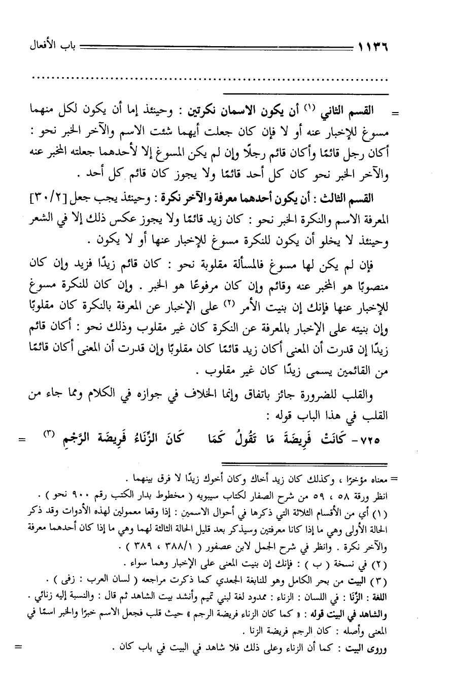 القسم الثالث: أن يكون أحدهما معرفة والآخر نكرة: وحينئذ يجب جعل [2/ 30] المعرفة الاسم والنكرة الخبر نحو: كان زيد قائما ولا يجوز عكس ذلك إلا في الشعر وحينئذ لا يخلو أن يكون للنكرة مسوغ للإخبار عنها أو لا يكون.