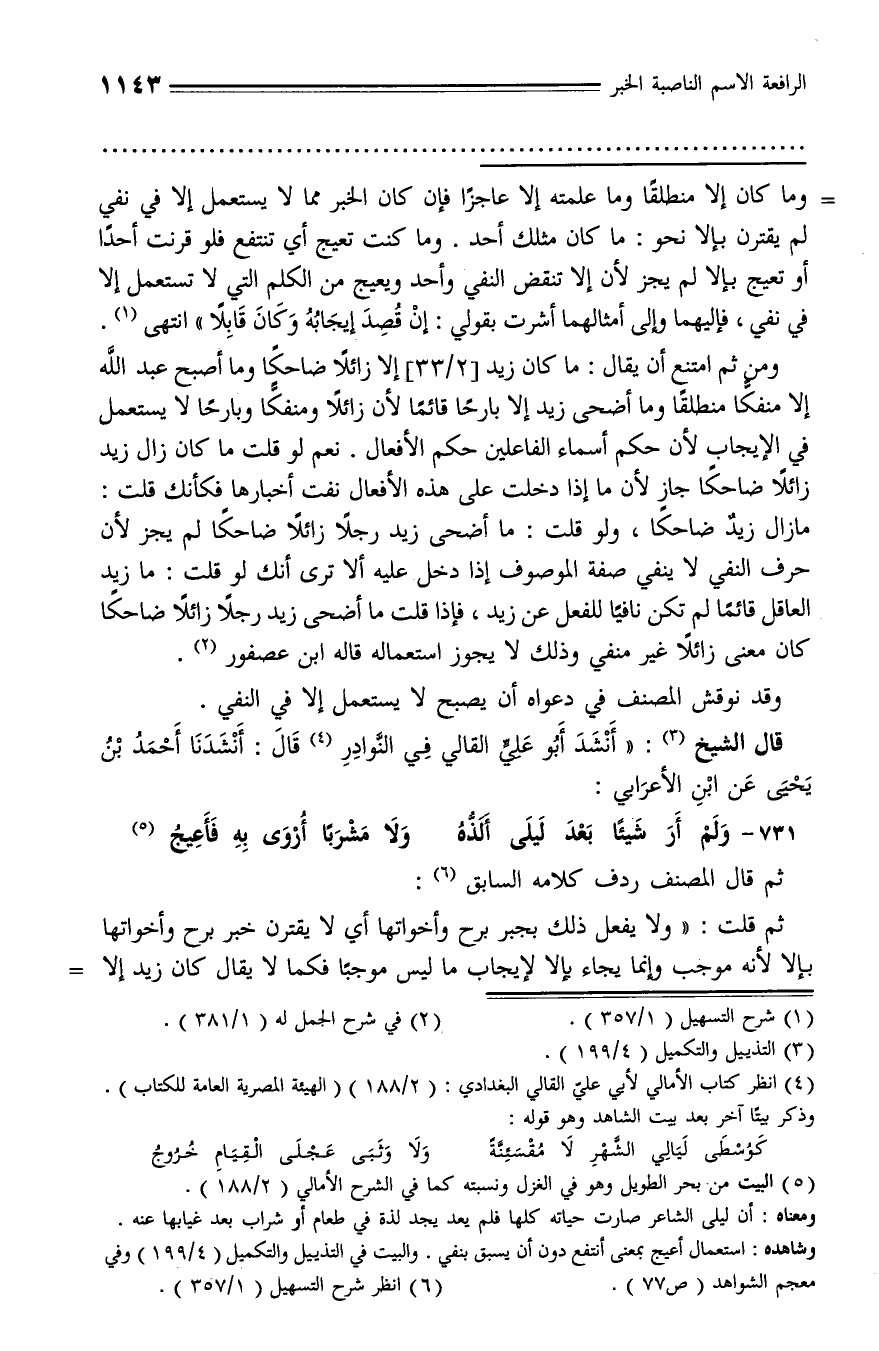 ثم قلت: «ولا يفعل ذلك بجبر برح وأخواتها أي لا يقترن خبر برح وأخواتها بإلا لأنه موجب وإنما يجاء بإلا لإيجاب ما ليس موجبا فكما لا يقال كان زيد إلا -