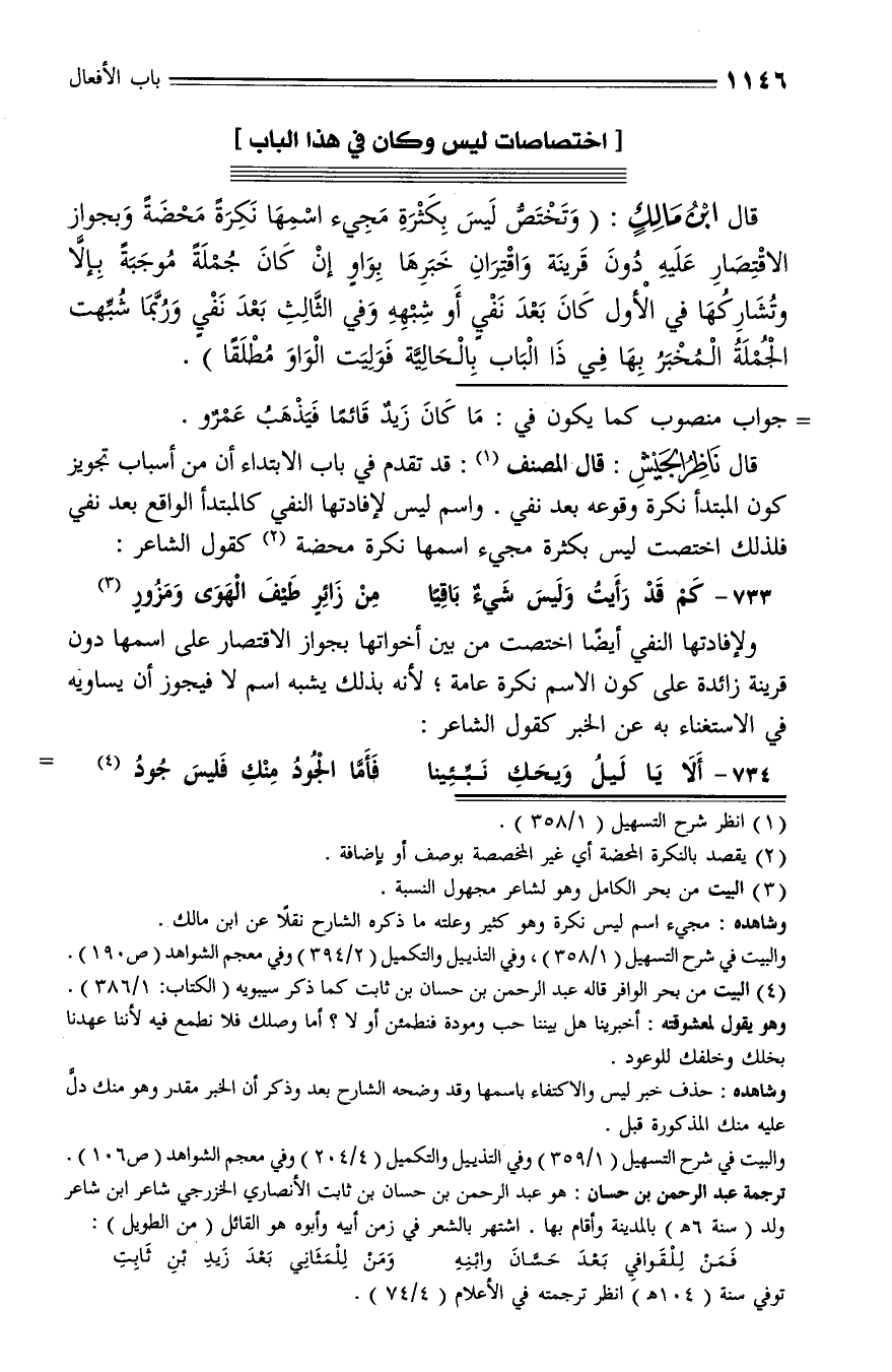قال ابن مالك: (وتختصّ ليس بكثرة مجيء اسمها نكرة محضة وبجواز الاقتصار عليه دون قرينة واقتران خبرها بواو إن كان جملة موجبة بإلّا وتشاركها في الأول كان بعد نفي أو شبهه وفي الثّالث بعد نفي وربّما شبّهت الجملة المخبر بها في ذا الباب بالحاليّة فوليت الواو مطلقا).