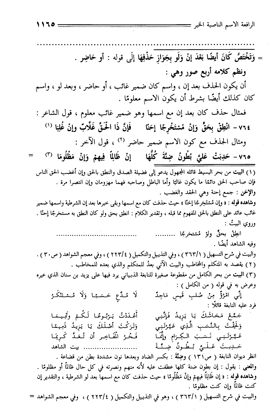 وشاهده قوله: «وإن مستخرجا إحنا» حيث حذفت كان مع اسمها وبقى خبرها بعد إن الشرطية واسمها ضمير غائب عائد على النطق بالحق المفهوم مما قبله، وتقدير الكلام: انطق بحق ولو كان النطق به مستخرجا إحنا.