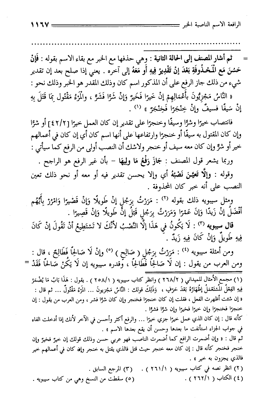 فانتصاب خيرا وشرّا وسيفا وخنجرا على تقدير إن كان العمل خيرا [2/ 42] أو شرّا وإن كان المقتول به سيفا أو خنجرا وارتفاعها على أنها اسم كان أي إن كان في أعمالهم خير أو شرّ وإن كان معه سيف أو خنجر ولا شك أن النصب أولى من الرفع كما سيأتي: