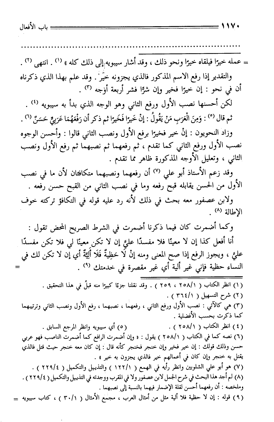 (¬6) نصه كما في الكتاب (1/ 258) يقول: «وإن أضمرت الرافع كما أضمرت الناصب فهو عربي حسن وذلك قولك: إن خير فخير وإن خنجر فخنجر كأنه قال: إن كان معه خنجر حيث قتل فالذي يقتل به خنجر وإن كان في أعمالهم خير فالذي يجزون به خير».