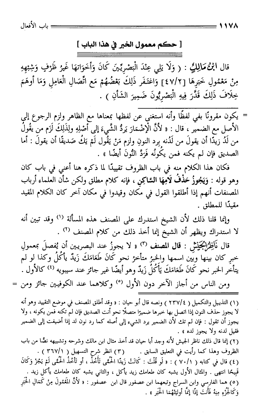 فكان هذا الكلام منه في باب الظروف تقييدا لما ذكره هنا أعني في باب كان وهو قوله: ويجوز حذف لامها السّاكن، فإنه كلام مطلق ولكن شأن العلماء أرباب المصنفات أنهم إذا أطلقوا القول في مكان وقيدوا في مكان آخر كان الكلام المقيد مقيدا للمطلق.