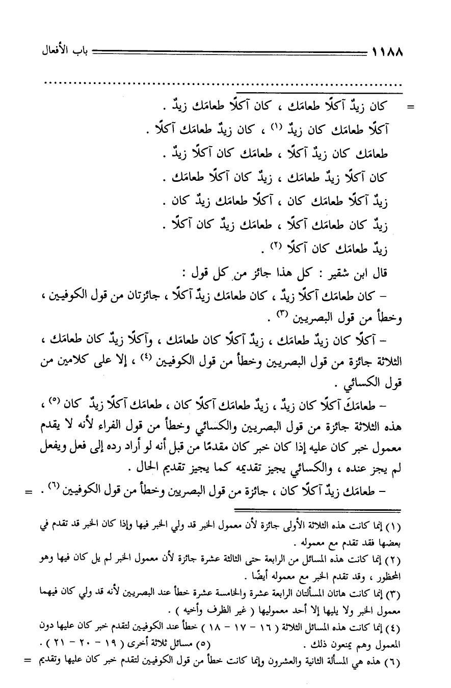 (¬4) إنما كانت هذه المسائل الثلاثة (16 - 17 - 18) خطأ عند الكوفيين لتقدم خبر كان عليها دون المعمول وهم يمنعون ذلك.
