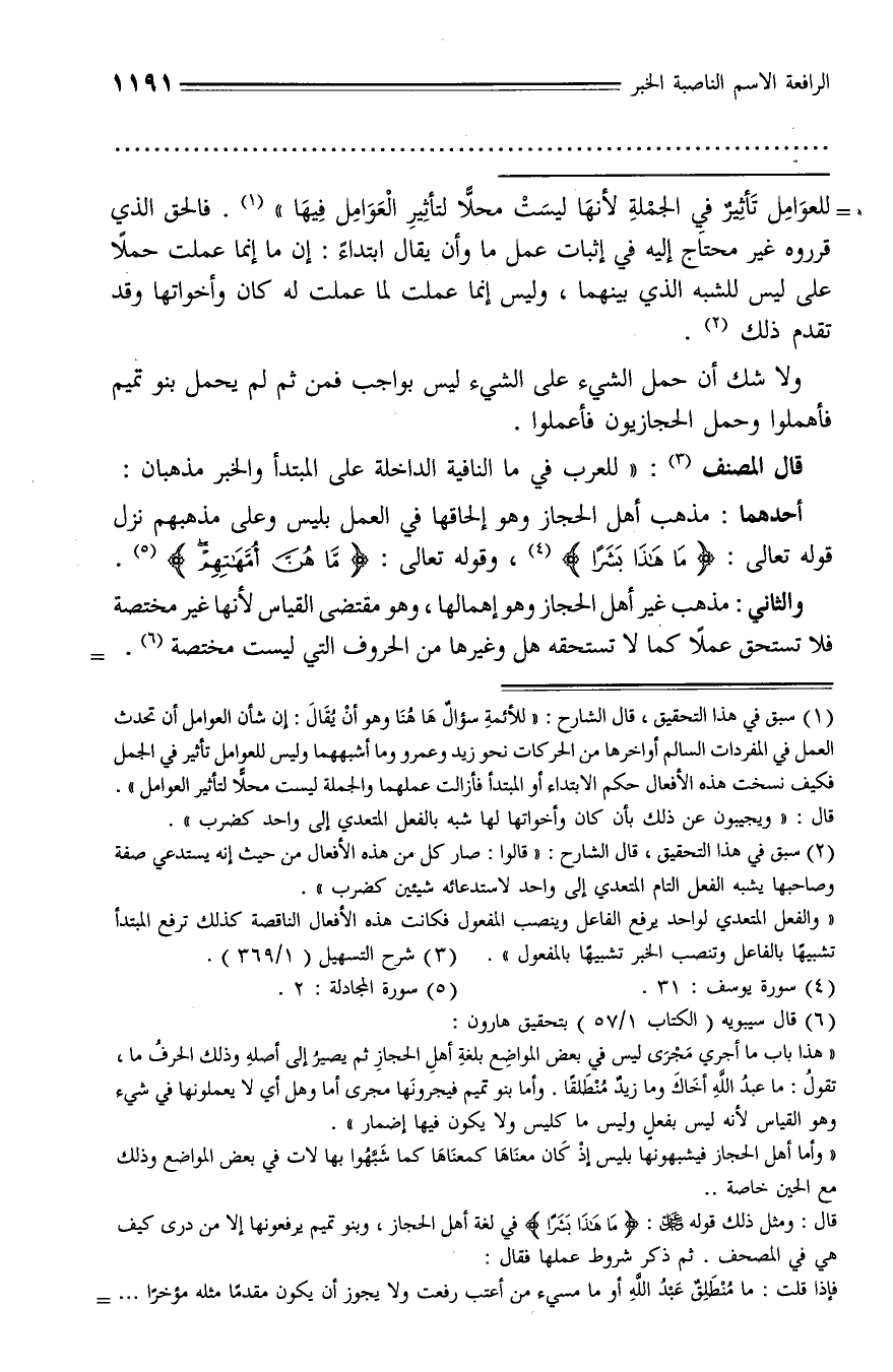 قال المصنف (¬3): «للعرب في ما النافية الداخلة على المبتدأ والخبر مذهبان: