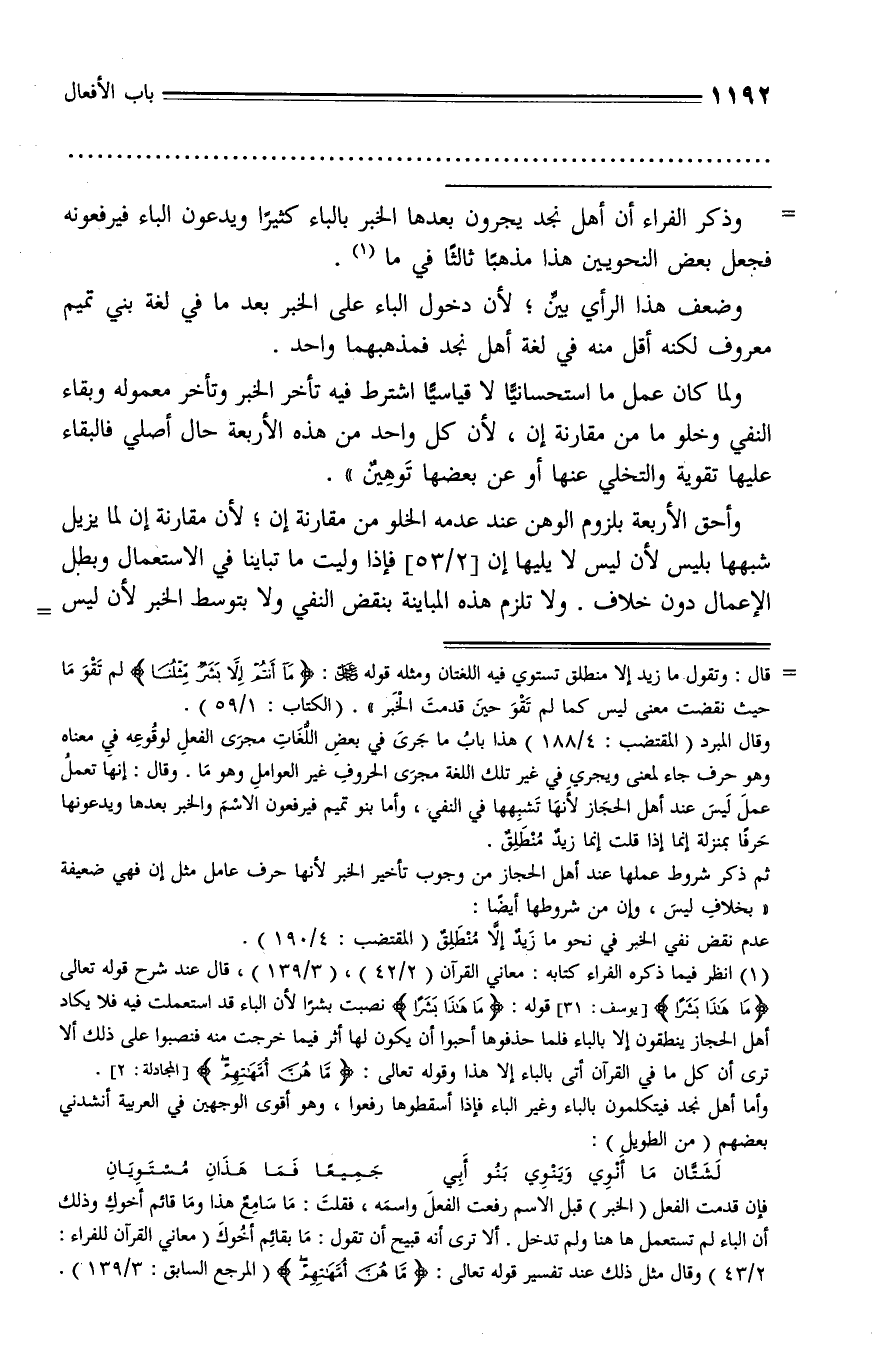 وذكر الفراء أن أهل نجد يجرون بعدها الخبر بالباء كثيرا ويدعون الباء فيرفعونه فجعل بعض النحويين هذا مذهبا ثالثا في ما (¬1).