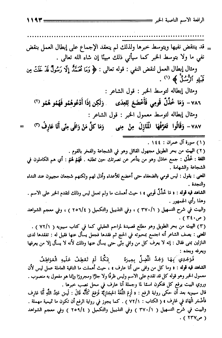ومثال إبطال العمل لنقض النفي: قوله تعالى: وَما مُحَمَّدٌ إِلَّا رَسُولٌ قَدْ خَلَتْ مِنْ قَبْلِهِ الرُّسُلُ (¬1).
