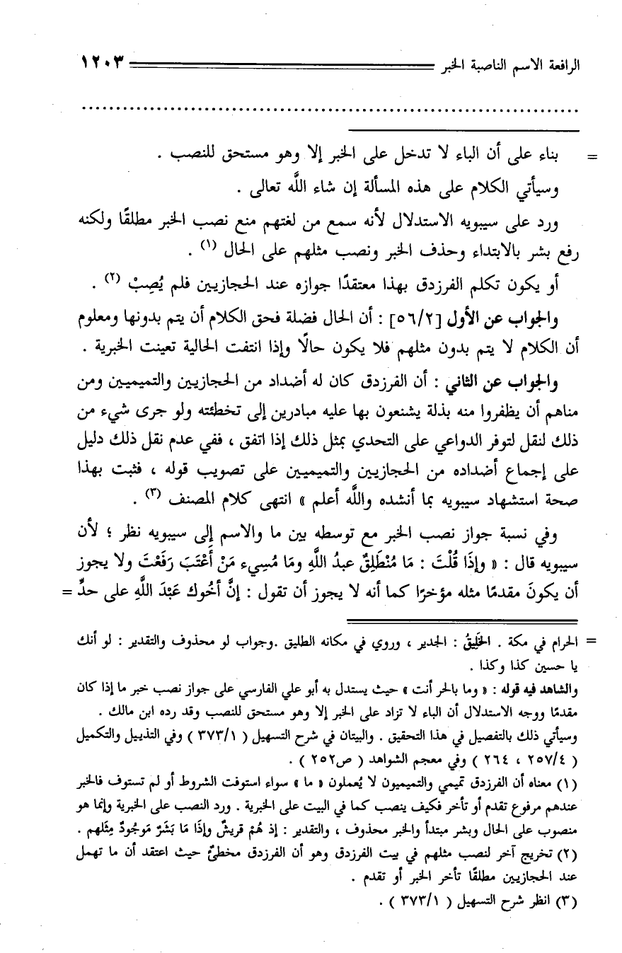 (¬1) معناه أن الفرزدق تميمي والتميميون لا يعملون «ما» سواء استوفت الشروط أو لم تستوف فالخبر عندهم مرفوع تقدم أو تأخر فكيف ينصب كما في البيت على الخبرية. ورد النصب على الخبرية وإنما هو منصوب على الحال وبشر مبتدأ والخبر محذوف، والتقدير: إذ هم قريش وإذا ما بشر موجود مثلهم.