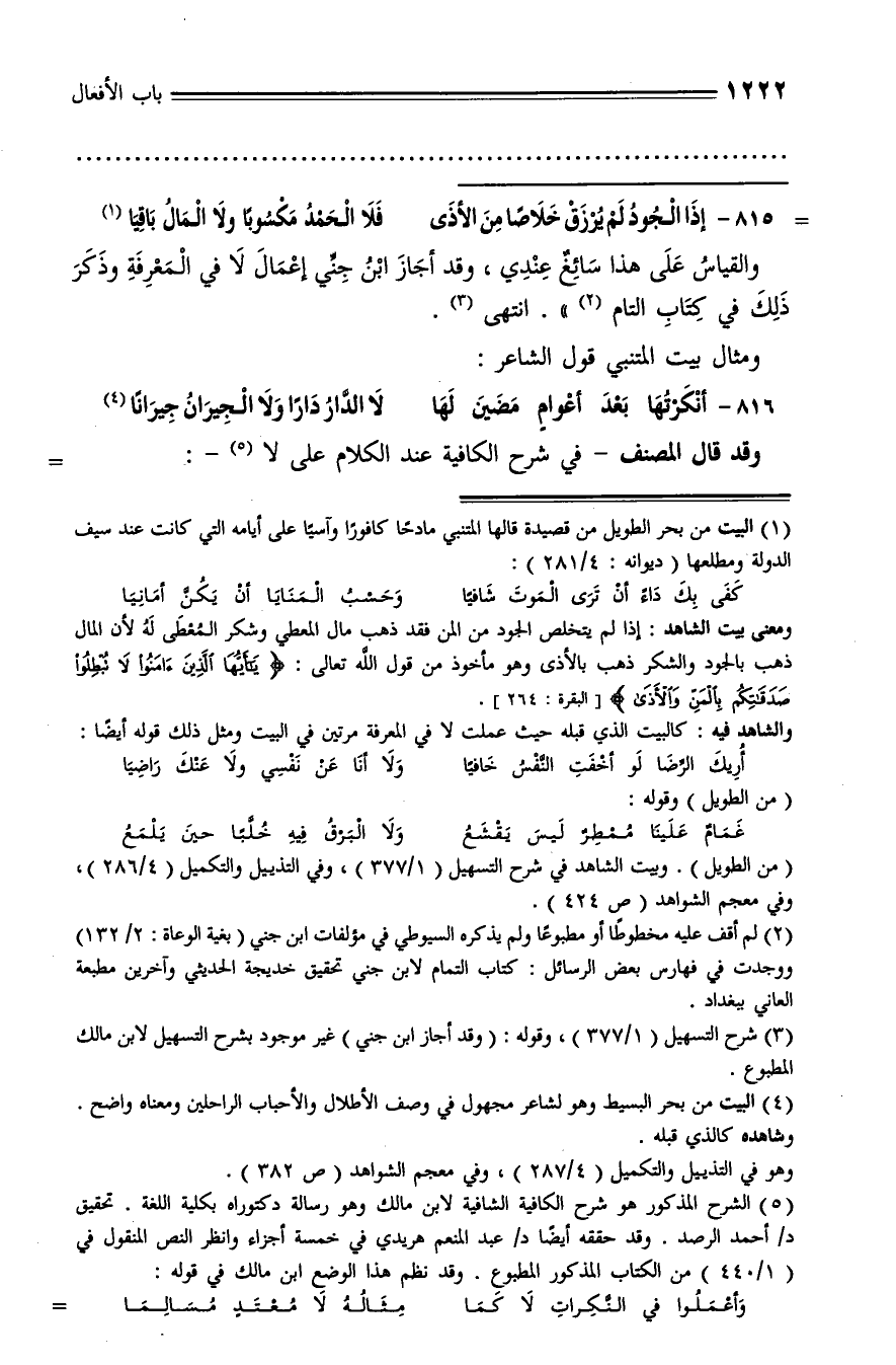 (¬5) الشرح المذكور هو شرح الكافية الشافية لابن مالك وهو رسالة دكتوراه بكلية اللغة. تحقيق د/ أحمد الرصد. وقد حققه أيضا د/ عبد المنعم هريدي في خمسة أجزاء وانظر النص المنقول في (1/ 440) من الكتاب المذكور المطبوع. وقد نظم هذا الوضع ابن مالك في قوله: