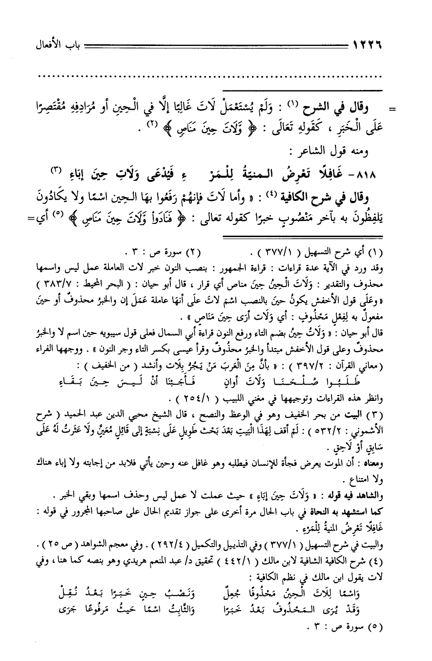 (¬4) شرح الكافية الشافية لابن مالك (1/ 442) تحقيق د/ عبد المنعم هريدي وهو بنصه كما هنا، وفي لات يقول ابن مالك في نظم الكافية: