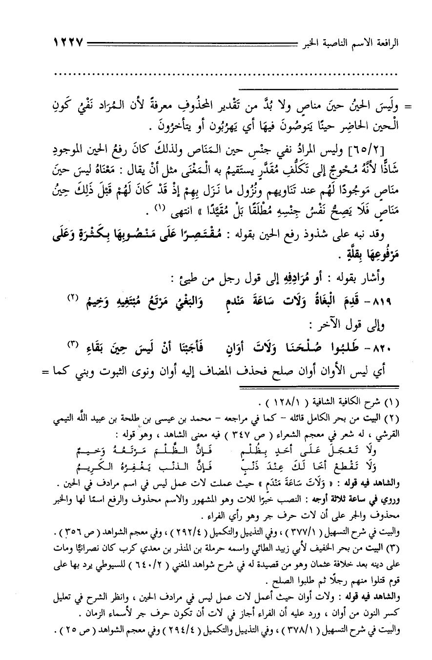[2/ 65] وليس المراد نفي جنس حين المناص ولذلك كان رفع الحين الموجود شاذّا لأنّه محوج إلى تكلّف مقدّر يستقيم به المغنى مثل أن يقال: معناه ليس حين مناص موجودا لهم عند تناويهم ونزول ما نزل بهم إذ قد كان لهم قبل ذلك حين مناص فلا يصحّ نفس جنسه مطلقا بل مقيّدا» انتهى (¬1).