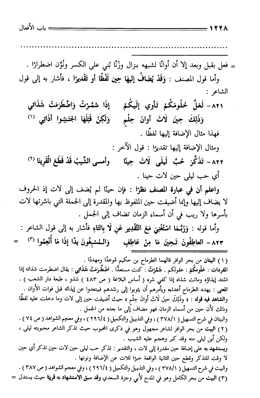 وأما قول المصنف: وقد يضاف إليها حين لفظا أو تقديرا، فأشار به إلى قول الشاعر: