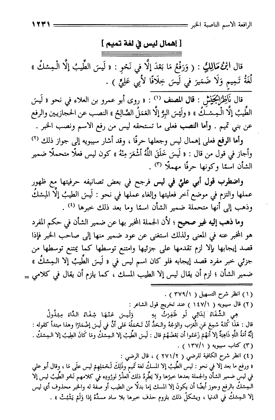 «ورفع ما بعد إلا في نحو: ليس الطّيب إلا المسك لغة تميم وذلك لحملهم ليس على ما، وقال أبو علي في ليس ضمير الشأن والجملة بعدها خبرها ولا يطّرد ذلك العذر لوروده في كلامهم نحو الطّيب ليس إلا المسك بالرفع وجوز أيضا أن يكون إلا المسك إما بدلا من الطيب أو صفة له والخبر محذوف أي ليس إلا المسك في الدنيا، ويشكل ذلك بلزوم حذف خبرها بلا ساد مسدّه إذا ولم يثبت».