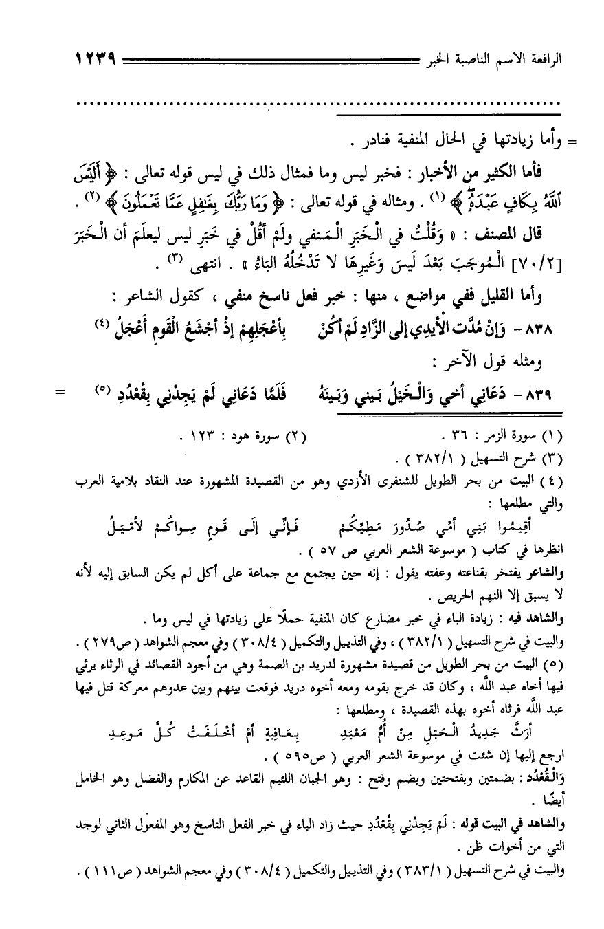 قال المصنف: «وقلت في الخبر المنفي ولم أقل في خبر ليس ليعلم أن الخبر [2/ 70] الموجب بعد ليس وغيرها لا تدخله الباء». انتهى (¬3).