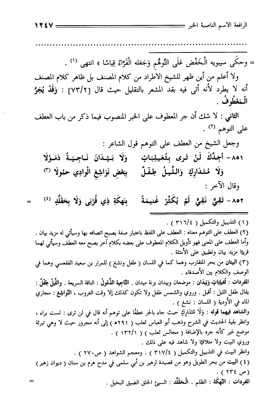 وجعل الشيخ من العطف على التوهم قول الشاعر: