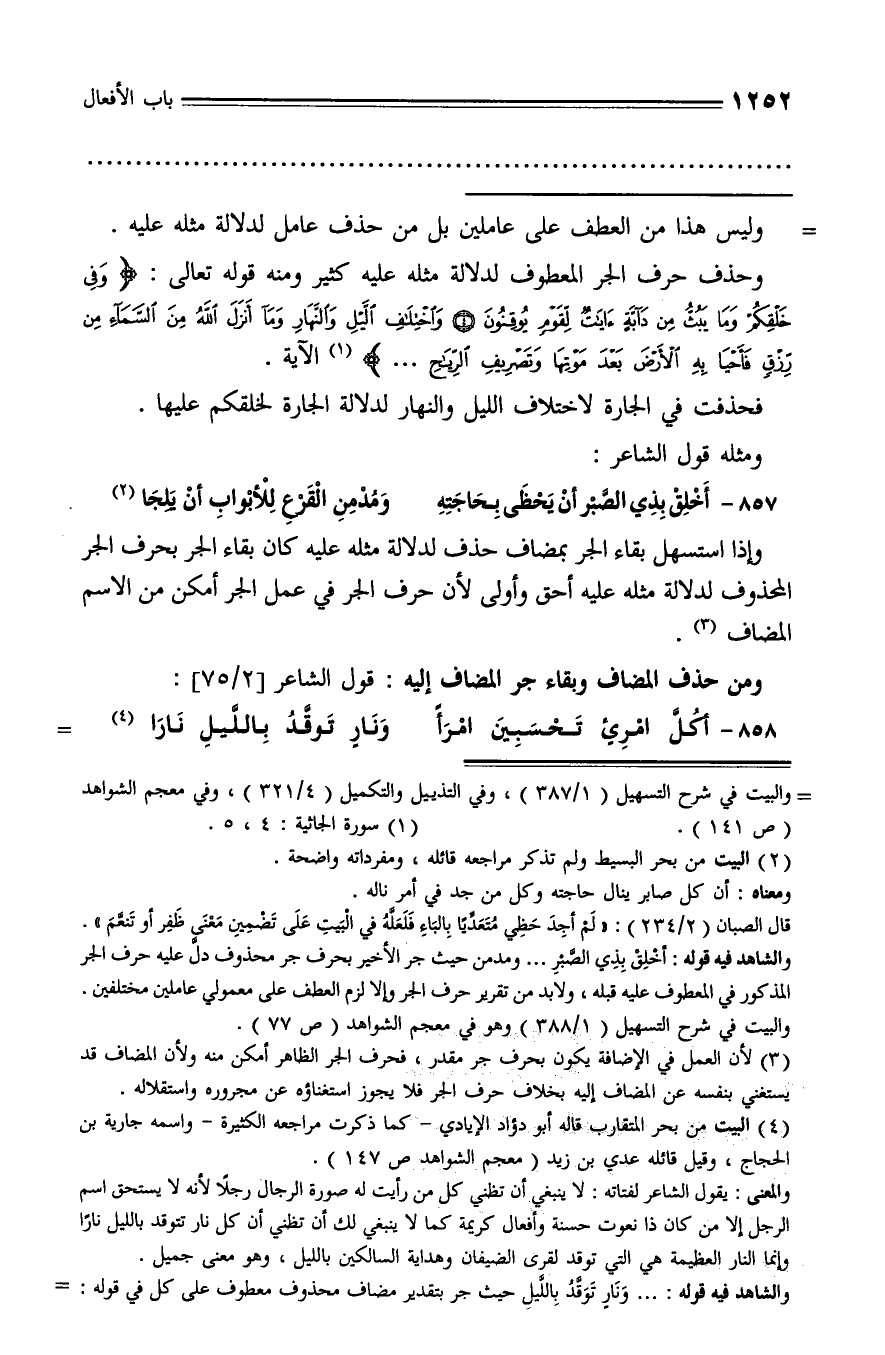 وإذا استسهل بقاء الجر بمضاف حذف لدلالة مثله عليه كان بقاء الجر بحرف الجر المحذوف لدلالة مثله عليه أحق وأولى لأن حرف الجر في عمل الجر أمكن من الاسم المضاف (¬3).