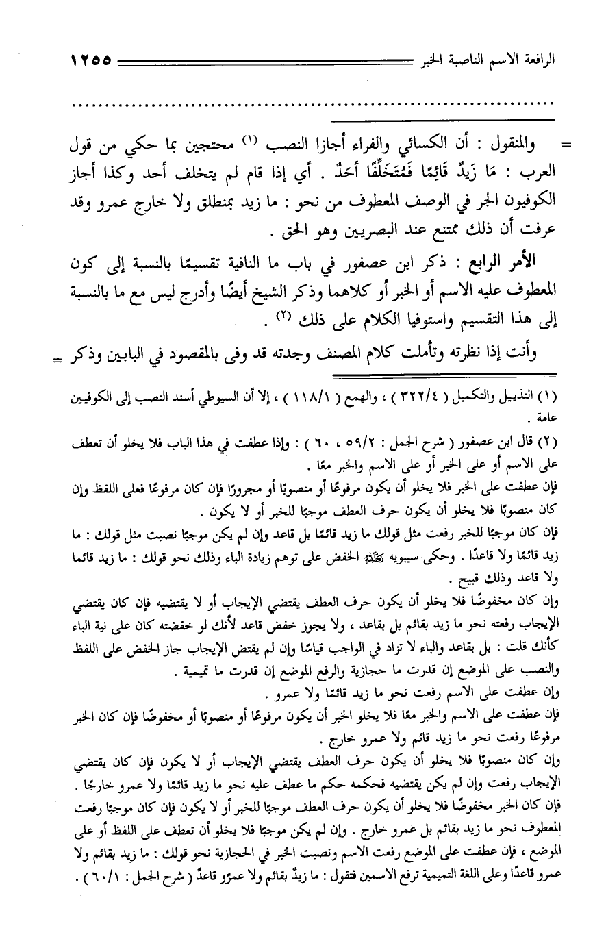 الأمر الرابع: ذكر ابن عصفور في باب ما النافية تقسيما بالنسبة إلى كون المعطوف عليه الاسم أو الخبر أو كلاهما وذكر الشيخ أيضا وأدرج ليس مع ما بالنسبة إلى هذا التقسيم واستوفيا الكلام على ذلك (¬2).