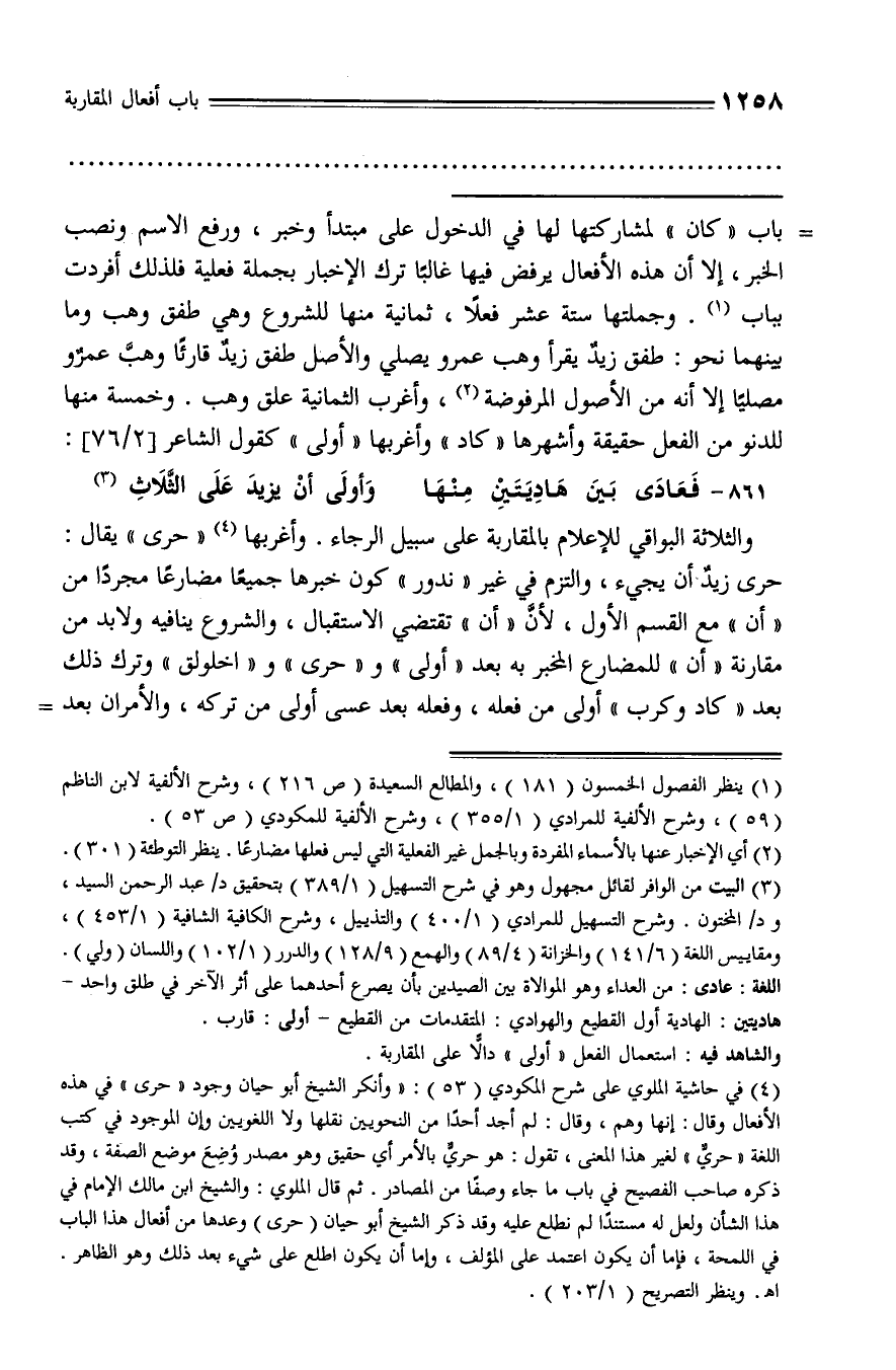 (¬4) في حاشية الملوي على شرح المكودي (53): «وأنكر الشيخ أبو حيان وجود «حرى» في هذه الأفعال وقال: إنها وهم، وقال: لم أجد أحدا من النحويين نقلها ولا اللغويين وإن الموجود في كتب اللغة «حريّ» لغير هذا المعنى، تقول: هو حريّ بالأمر أي حقيق وهو مصدر وضع موضع الصفة، وقد ذكره صاحب الفصيح في باب ما جاء وصفا من المصادر. ثم قال الملوي: والشيخ ابن مالك الإمام في هذا الشأن ولعل له مستندا لم نطلع عليه وقد ذكر الشيخ أبو حيان (حرى) وعدها من أفعال هذا الباب في اللمحة، فإما أن يكون اعتمد على المؤلف، وإما أن يكون اطلع على شيء بعد ذلك وهو الظاهر.