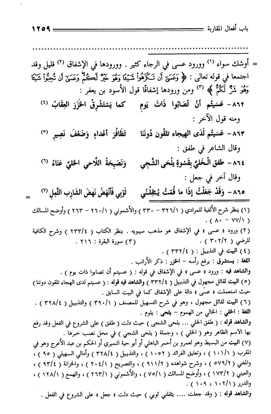 (¬2) ورود «عسى» في الإشفاق هو مذهب سيبويه. ينظر الكتاب (4/ 233) وشرح الكافية للرضي (2/ 302).