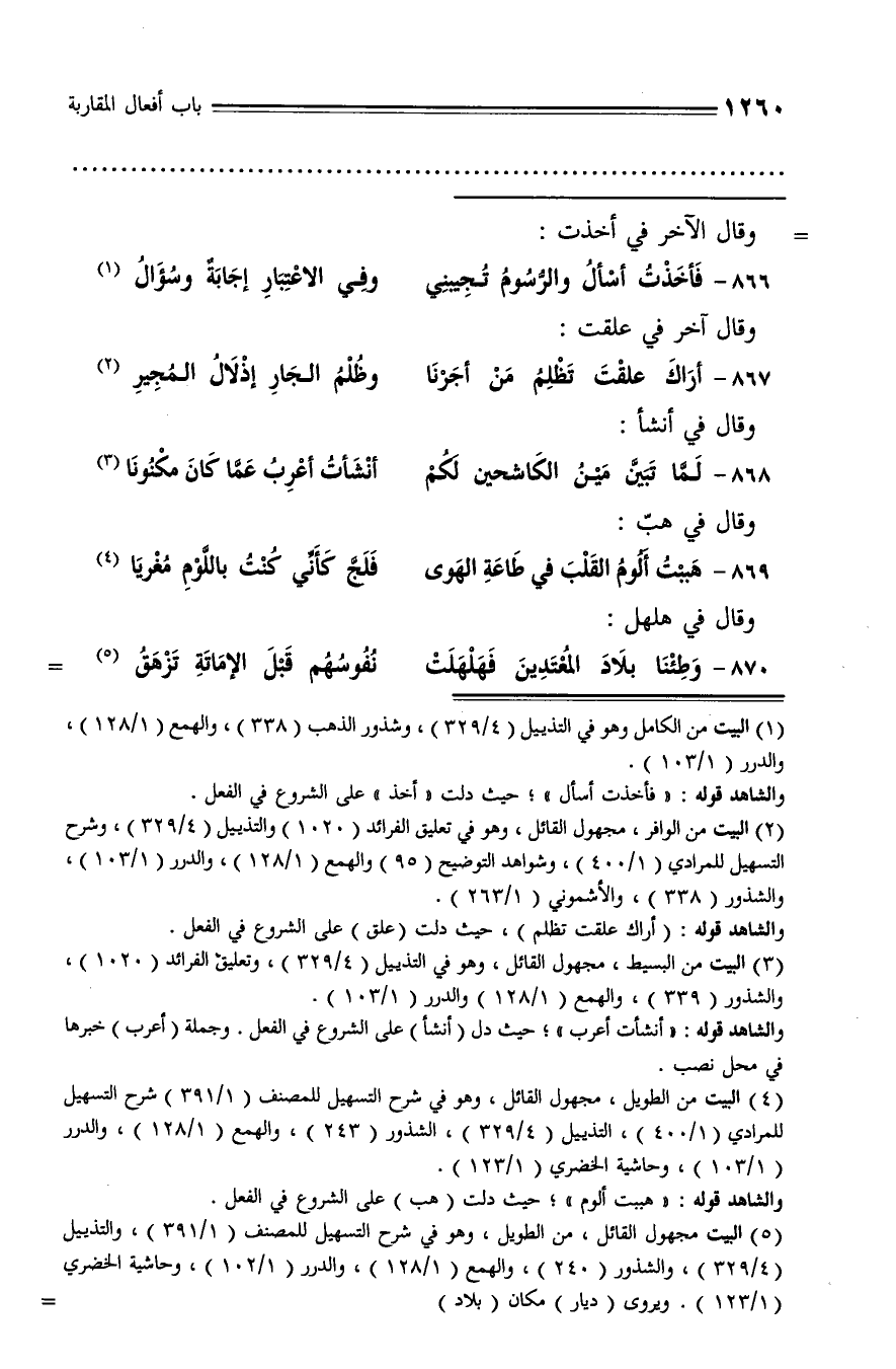 والشاهد قوله: «أنشأت أعرب»؛ حيث دل (أنشأ) على الشروع في الفعل. وجملة (أعرب) خبرها في محل نصب.