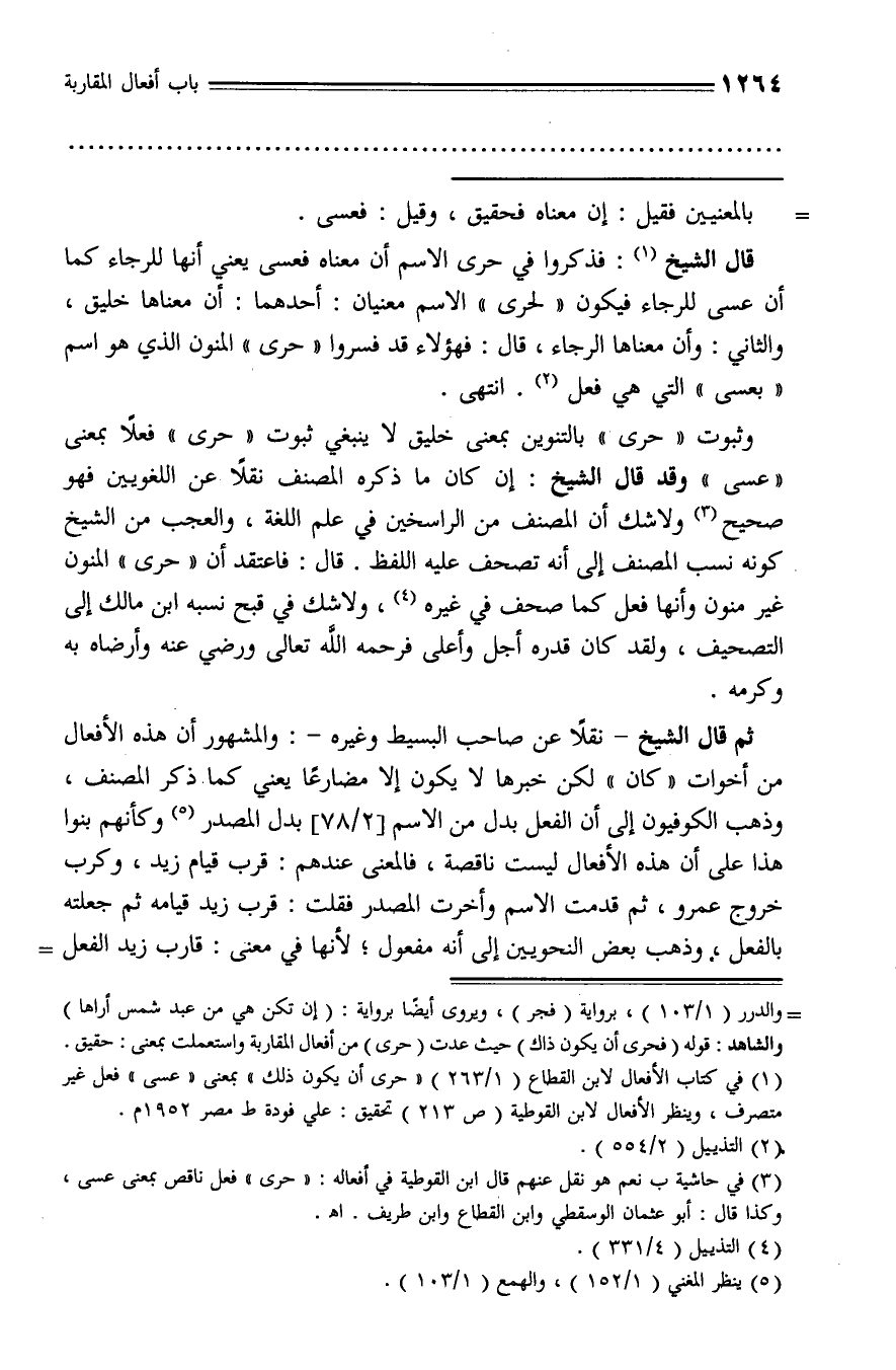 وثبوت «حرى» بالتنوين بمعنى خليق لا ينبغي ثبوت «حرى» فعلا بمعنى «عسى» وقد قال الشيخ: إن كان ما ذكره المصنف نقلا عن اللغويين فهو صحيح (¬3) ولا شك أن المصنف من الراسخين في علم اللغة، والعجب من الشيخ كونه نسب المصنف إلى أنه تصحف عليه اللفظ. قال: فاعتقد أن «حرى» المنون غير منون وأنها فعل كما صحف في غيره (¬4)، ولا شك في قبح نسبه ابن مالك إلى التصحيف، ولقد كان قدره أجل وأعلى فرحمه الله تعالى ورضي عنه وأرضاه به وكرمه.