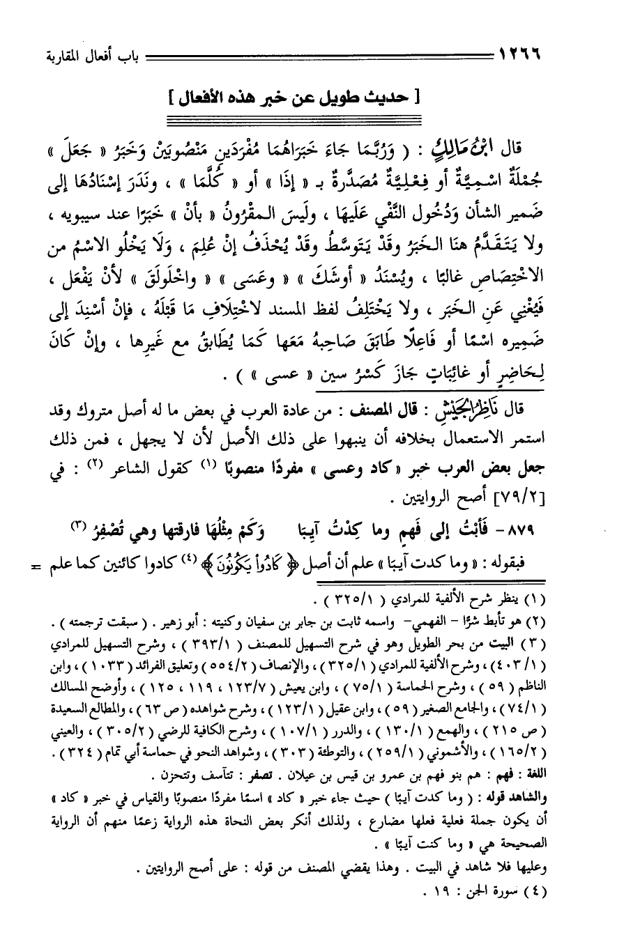 قال ناظر الجيش: قال المصنف: من عادة العرب في بعض ما له أصل متروك وقد استمر الاستعمال بخلافه أن ينبهوا على ذلك الأصل لأن لا يجهل، فمن ذلك جعل بعض العرب خبر «كاد وعسى» مفردا منصوبا (¬1) كقول الشاعر (¬2): في [2/ 79] أصح الروايتين.