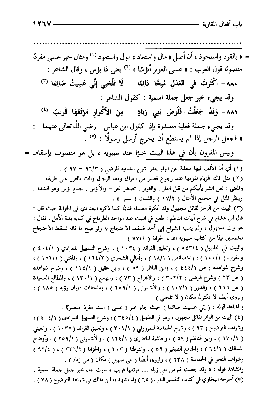 «بالقود واستحوذ» أن أصل «مال واستعاد» مول واستعود (¬1) ومثال خبر عسى مفردا منصوبا قول العرب: