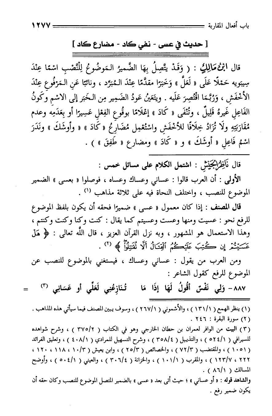 الأولى: أن العرب قالوا: عساني وعساك وعساه، فوصلوا «بعسى» الضمير الموضوع للنصب، واختلف النحاة فيه على ثلاثة مذاهب (¬1).