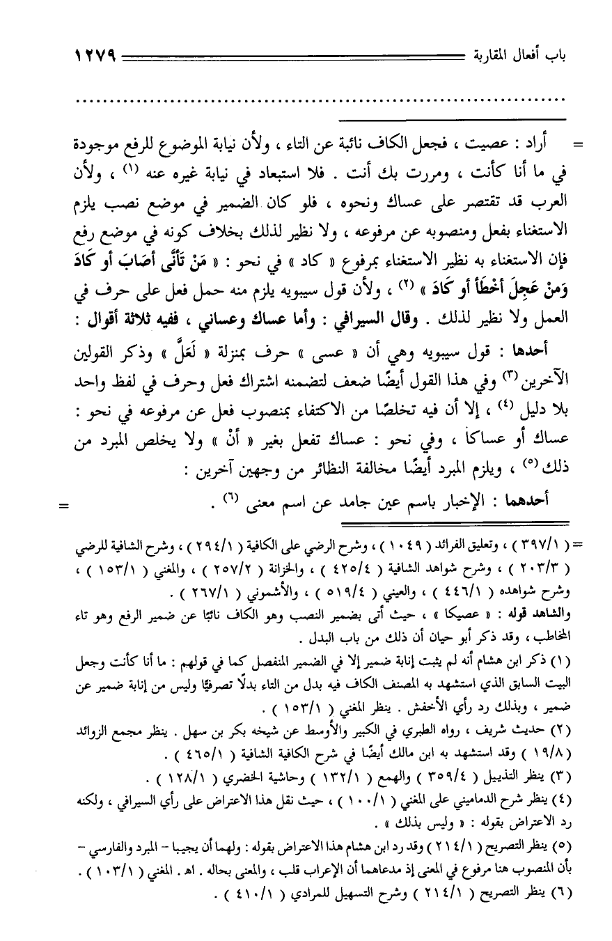 أراد: عصيت، فجعل الكاف نائبة عن التاء، ولأن نيابة الموضوع للرفع موجودة في ما أنا كأنت، ومررت بك أنت. فلا استبعاد في نيابة غيره عنه (¬1)، ولأن العرب قد تقتصر على عساك ونحوه، فلو كان الضمير في موضع نصب يلزم الاستغناء بفعل ومنصوبه عن مرفوعه، ولا نظير لذلك بخلاف كونه في موضع رفع فإن الاستغناء به نظير الاستغناء بمرفوع «كاد» في نحو: «من تأنّى أصاب أو كاد ومن عجل أخطأ أو كاد» (¬2)، ولأن قول سيبويه يلزم منه حمل فعل على حرف في العمل ولا نظير لذلك. وقال السيرافي: وأما عساك وعساني، ففيه ثلاثة أقوال: