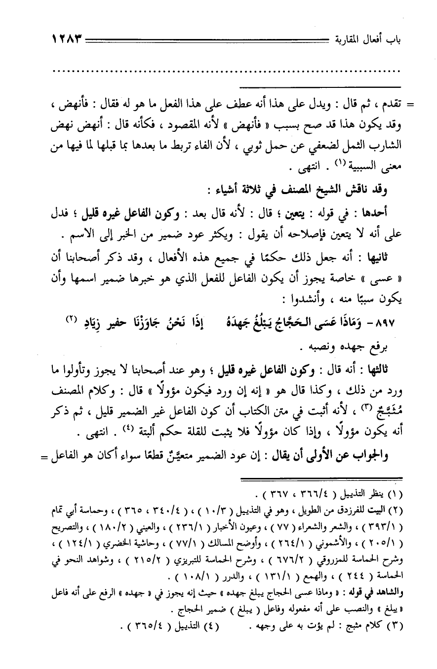 ثالثها: أنه قال: وكون الفاعل غيره قليل؛ وهو عند أصحابنا لا يجوز وتأولوا ما ورد من ذلك، وكذا قال هو «إنه إن ورد فيكون مؤولا» قال: وكلام المصنف مثبّج (¬3)، لأنه أثبت في متن الكتاب أن كون الفاعل غير الضمير قليل، ثم ذكر أنه يكون مؤولا، وإذا كان مؤولا فلا يثبت للقلة حكم ألبتة (¬4). انتهى.