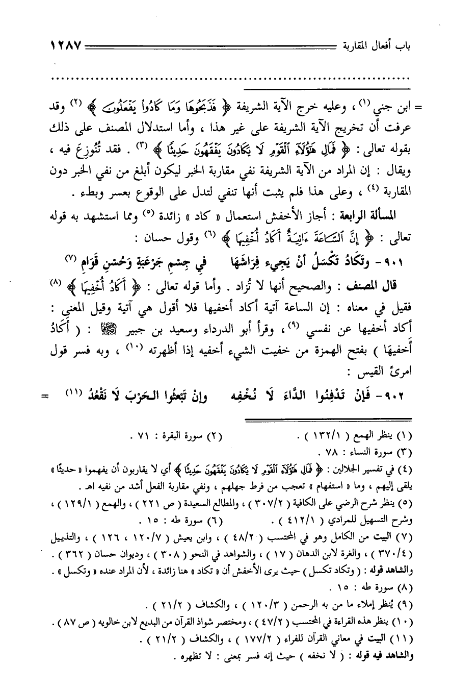 ابن جني (¬1)، وعليه خرج الآية الشريفة فَذَبَحُوها وَما كادُوا يَفْعَلُونَ (¬2) وقد عرفت أن تخريج الآية الشريفة على غير هذا، وأما استدلال المصنف على ذلك بقوله تعالى: فَمالِ هؤُلاءِ الْقَوْمِ لا يَكادُونَ يَفْقَهُونَ حَدِيثاً (¬3). فقد تنوزع فيه، ويقال: إن المراد من الآية الشريفة نفي مقاربة الخبر ليكون أبلغ من نفي الخبر دون المقاربة (¬4)، وعلى هذا فلم يثبت أنها تنفي لتدل على الوقوع بعسر وبطء.